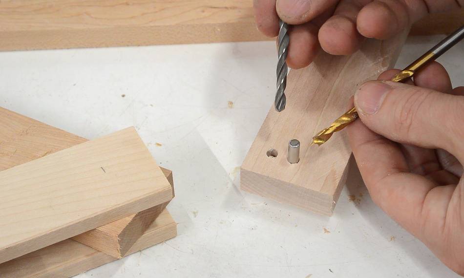 are drilled with a 3/16" metal bit, the loose holes with a 3/16" brad point bit.