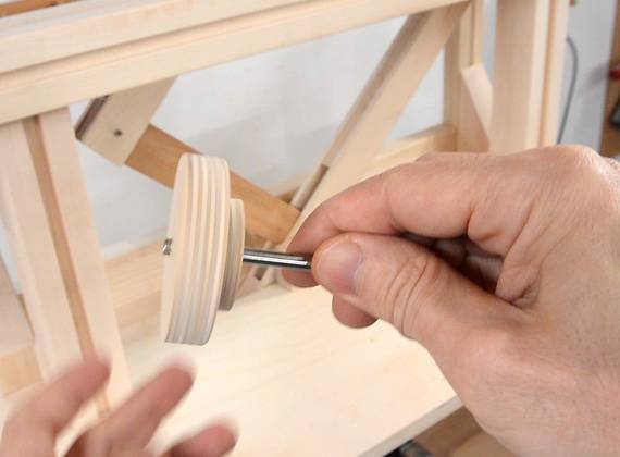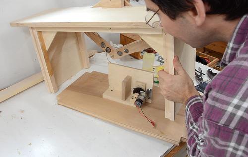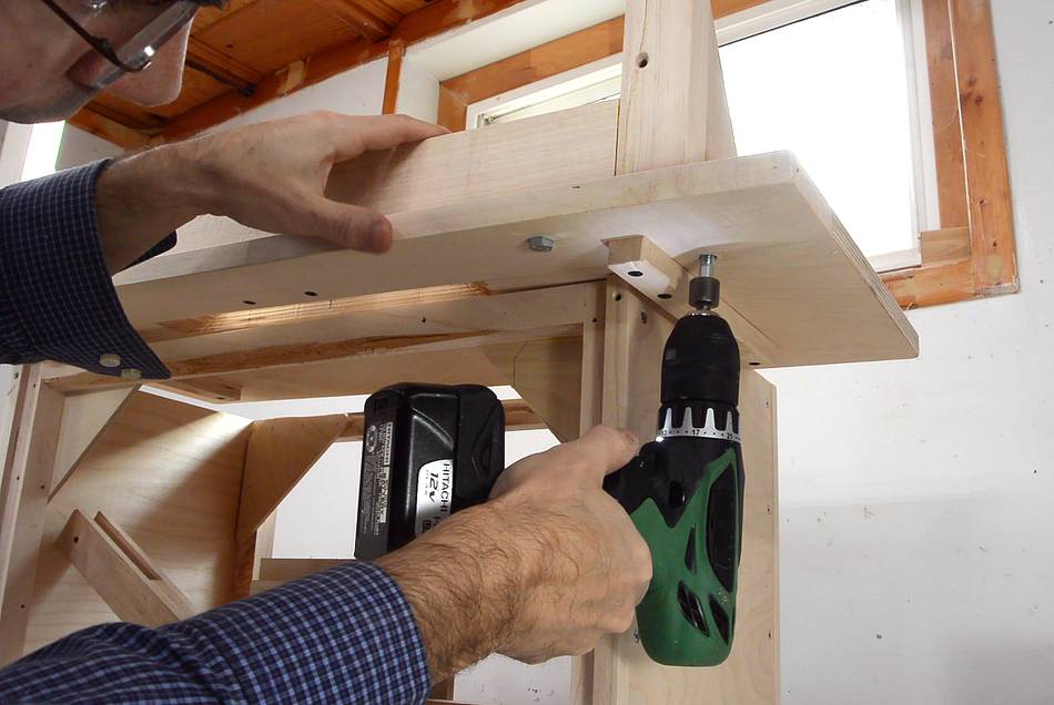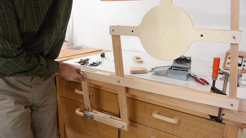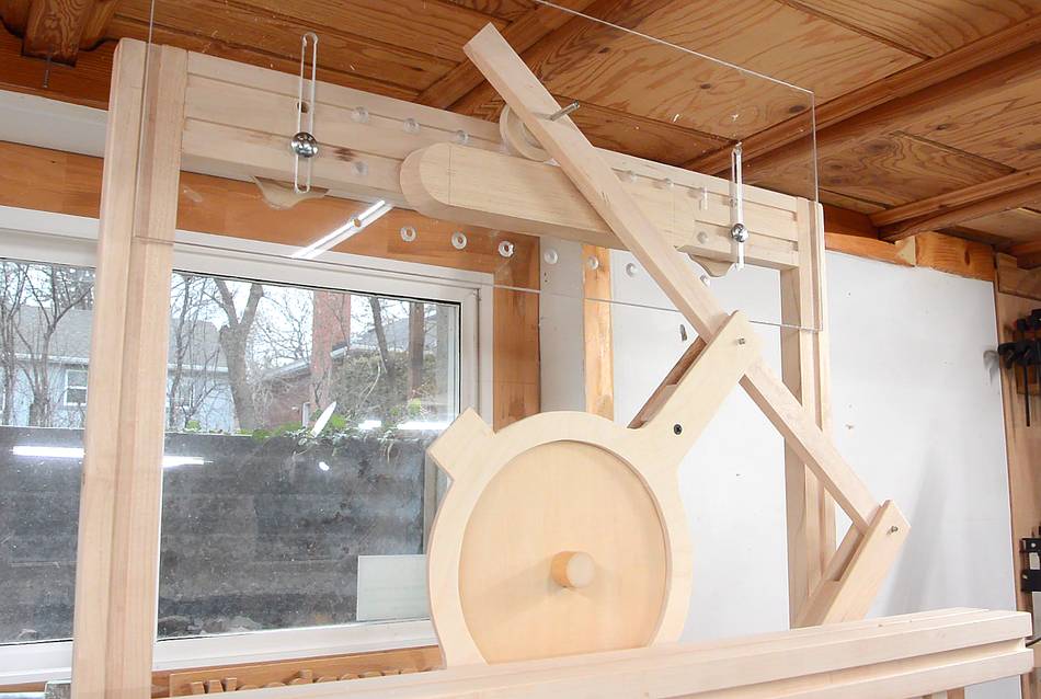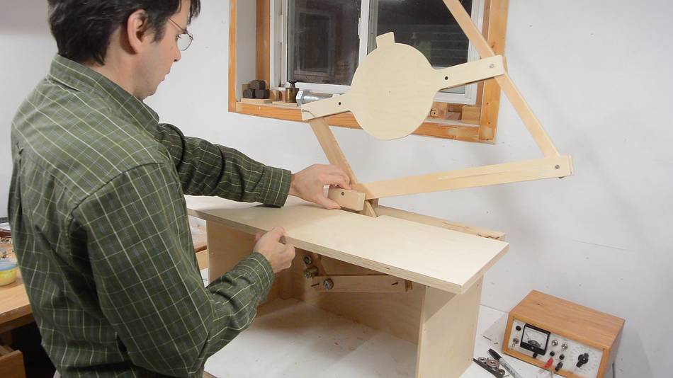 I tested the whole thing on my workbench. I had to make a shorter version of the "operating lever", because the handle extension kept hitting the ceiling.
