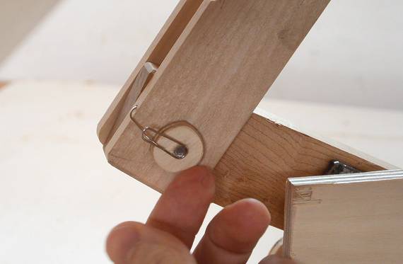 I drilled some very small holes in the links next to the pins and used paper clips to hook the pins in place. The pins have flat plywood knobs on them and the paperclip hooks to that.