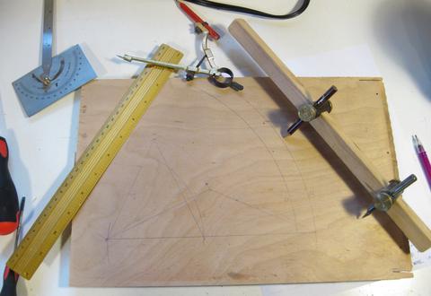 So I started experimenting with the geometry with a compass, ruler, protractor, and some trammel points.