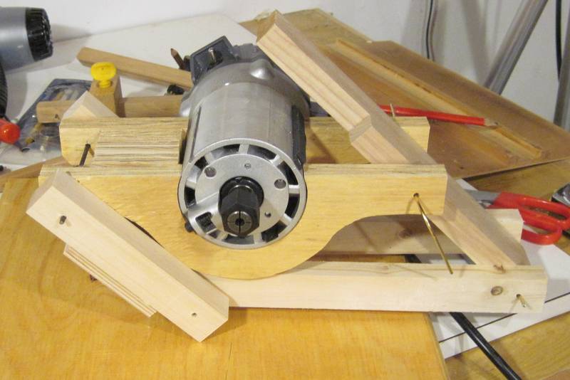 My original idea was to have the axis of the router horizontal, with the weight