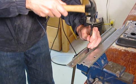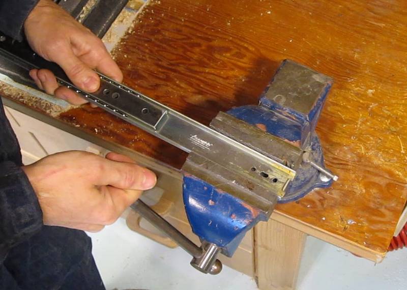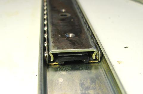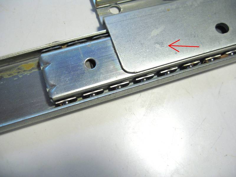 An 'S' profile bracket is spot welded onto the upper and lower rails to connect them together. The arrow in the photo at left points to the spot weld. It really doesn't show up very well from this side. It's much more visible from the other side, but to get at it we have to take the slide apart. If you are using keyboard drawer slides, there are also some spot welds to drill out, but center drawer slides require the least amount of modifications.
