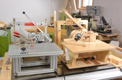 Putting the machines side by side, what immediately struck me was, despite completely different construction, how very similar the two machines are. I guess Kuldeep liked the overall dimensions of my design and didn't see a need to change those. The table on the wooden one is slightly deeper though, and Kuleep's design can back the router further from the table.