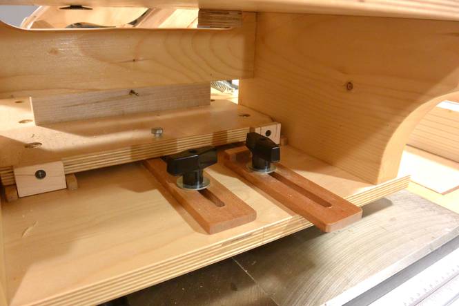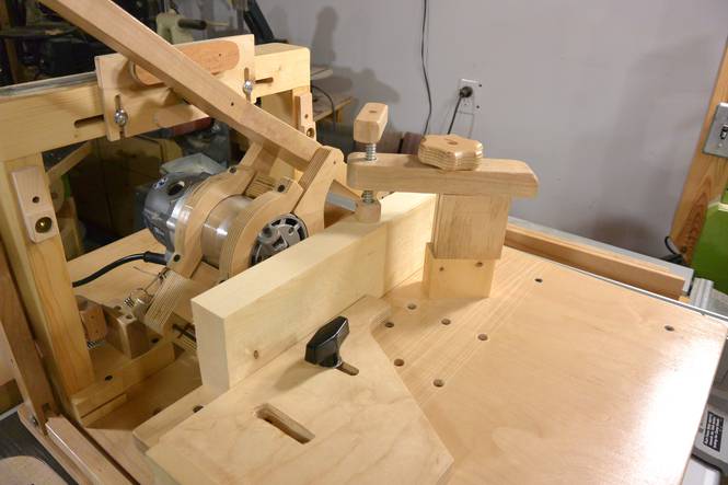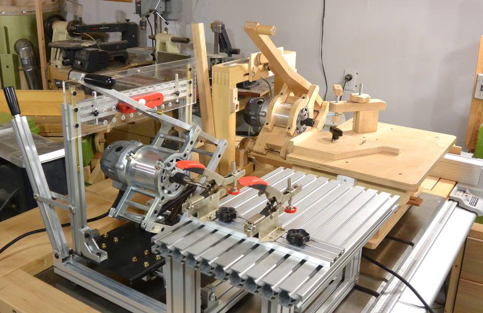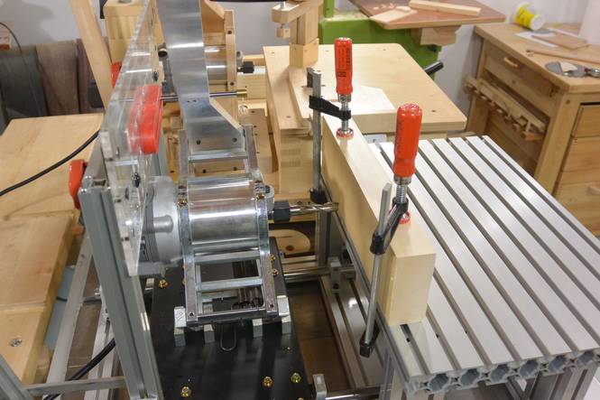 Putting the clamp over the back edge worked so well that I wanted to be able to do this on the wooden one as well, so I cut away part of the table support to be able to get the clamps in there. I will probably end up using both machines going forward, depending on the job, whichever machine is more convenient for the job at hand. Both machines, with the router installed, weigh about 43 pounds (19.5 kg). With similar overall dimensions, they are both equally portable. I probably spent about $60 building my pantorouter, but I also already had some materials lying around. The all-metal one will cost you more than ten times as much, but it will also take you less than a tenth of the time to assemble and set up than it does to build a wooden one.