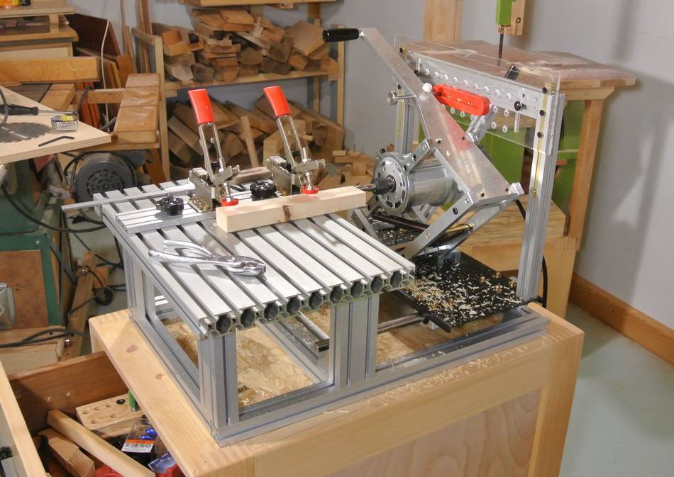 The table, with the many slots on it is also very nice for jigging things up on. Although for very thick (5 cm or more) work pieces, the toggle clamps don't open far enough. So I just put bar clamps over the edges of the table for larger pieces. I should add, the toggle clamps are not included by default (an extra $65 option)