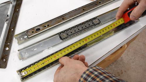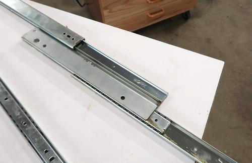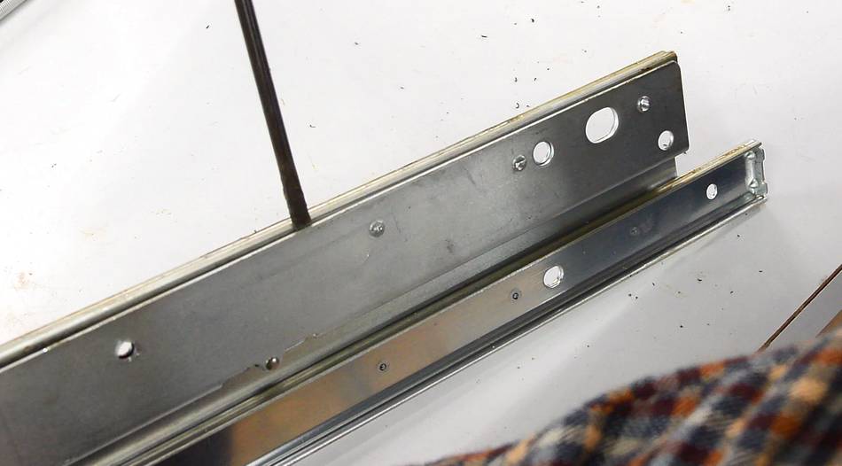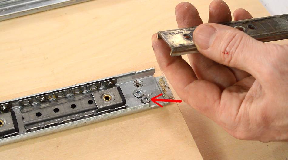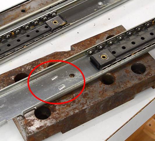 Drawer slides normally have these tabls (that I flattened to get the ball cages out) to prevent them from coming out. These tabs were in the wrong position. I added a screw to retain the ball cages in the upper half of the tracks. However, the first time I put a screw in, I put it too close to the edge and it hit the inner track. So I had to drill another hole on the opposite side (arrow pointing), and put a screw there, closer to the center. In retrospect, maybe I should have just put a washer under the mounting screw head so that that screw's head comes up further and hits the ball cage.