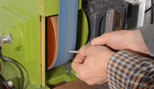 So I rigged up a sort of self-centering center-punch, by grinding a taper onto the end of a spacer on my belt grinder. A belt sander or any sort of grinder would work just as well. I let the spacer spin freely as I ground it to ensure I got a consistent cone shape on it.