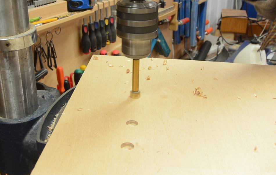I transferred the location for the counter-bored holes for the washers to the other side by drilling some small pilot holes though the wood. I then used the pilot holes to guide the larger Forstner bit for counterboring the holes for the washers, and after that drilled the screw holes.