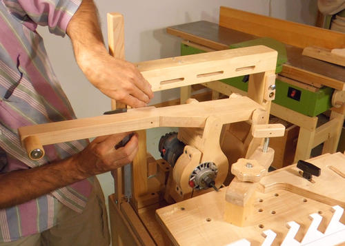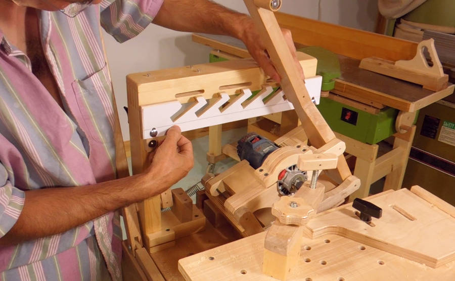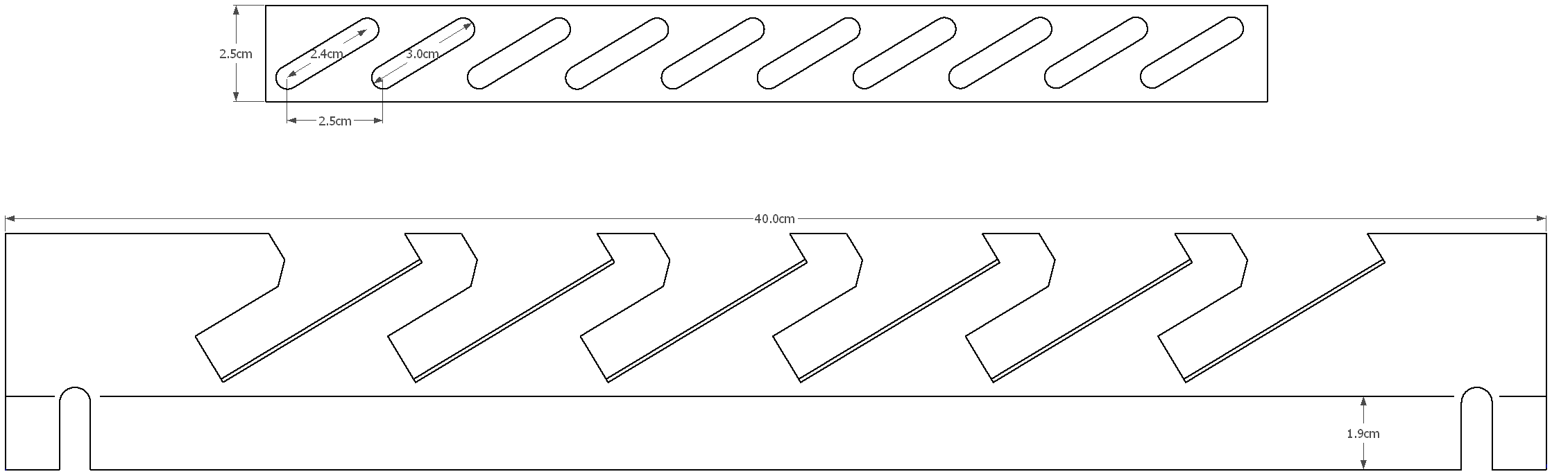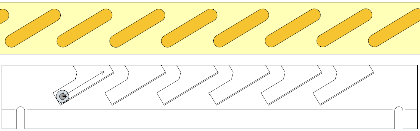 I used that shape to then generate a template for cutting the slanted mortises. The template has a series of angled tracks that the follower guide bearing can roll around in. Basically, the template is for making a series of angled mortises in a rail.