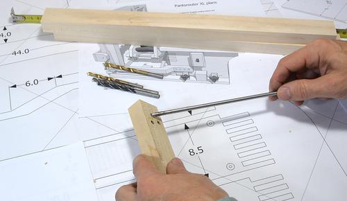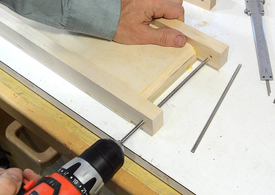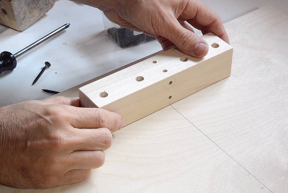 I then mark the hole locations by inserting screws in the holes, and tapping them down with a hammer. The point of the screws makes a divot in the wood to mark where to drill the pilot holes.