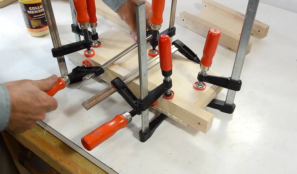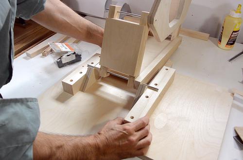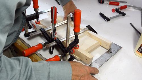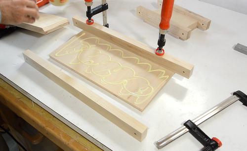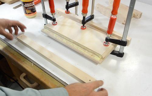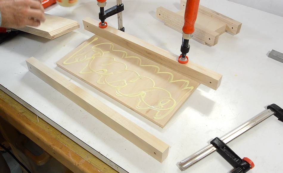 Freshly applied glue is very slippery, so to keep parts aligned, I clamp on one of the long pieces to the plywood without any glue, then apply glue to the thinner bottom layer...