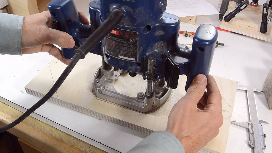 Most people mount routers in jigs by screwing the base to a piece of plywood. This method would work for this mount as well, but I'd lose a little bit of depth of cut. So instead, I'm mounting it by two metal rods. Nearly all router bases have holes for two metal rods, for use with various jigs.