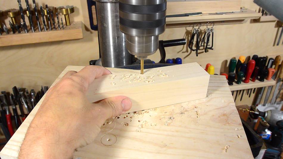 These need to be very square. To compensate for any non-square-ness that my drill press may have, I drill the hole about 5 mm in then rotate the block 180 degrees (around the axis of the drill bit) and drill another 5 mm, repeating until I'm all the way through. If the drill press table has any tilt error, every 180-degree rotation effectively reverses that.