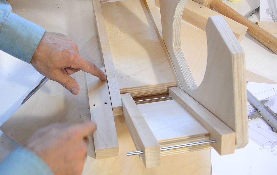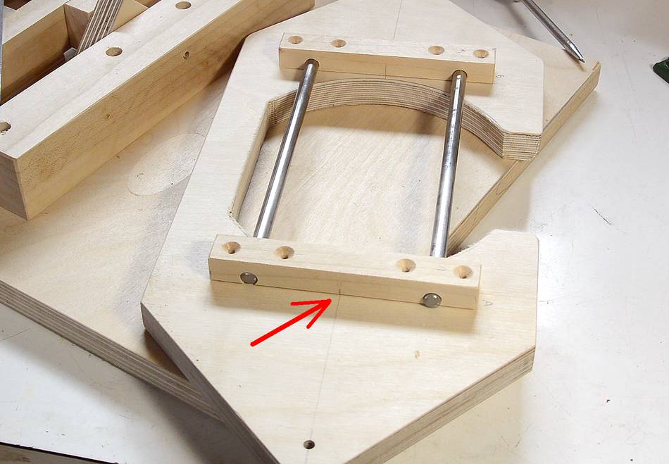 A number of people have "improved" on my design by drilling larger holes and using bronze bushings in the holes. But that means you can't use this trick to get the holes fully aligned. The bronze bushings do last longer. A steel rod in a wooden hole might wear out after cutting as few as ten thousand joints. But if you are at all concerned about wear, put oil in the holes and polish the rods, and it should last much longer.