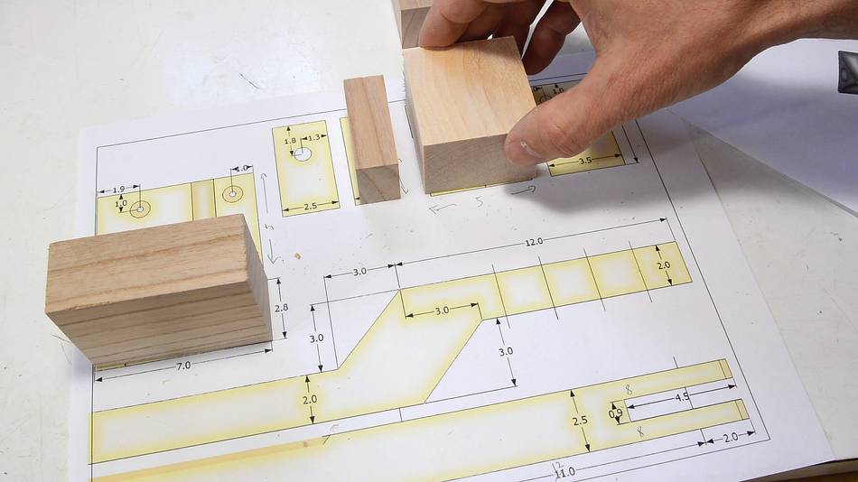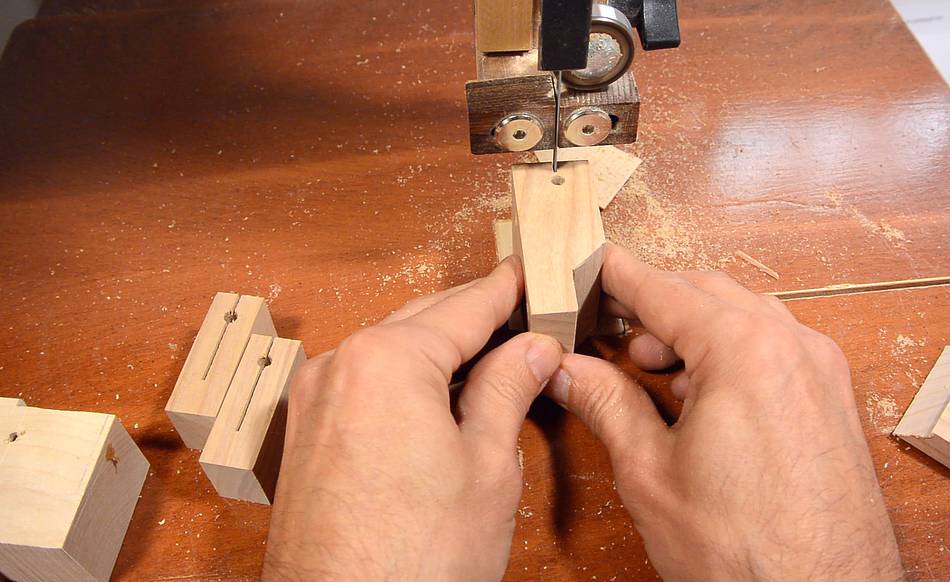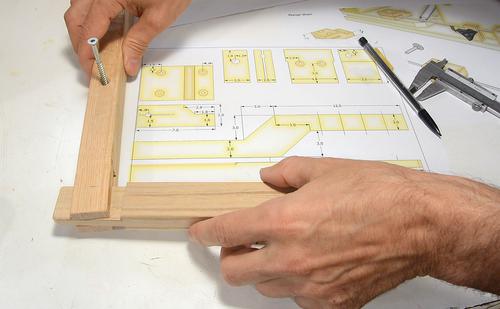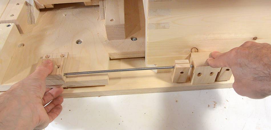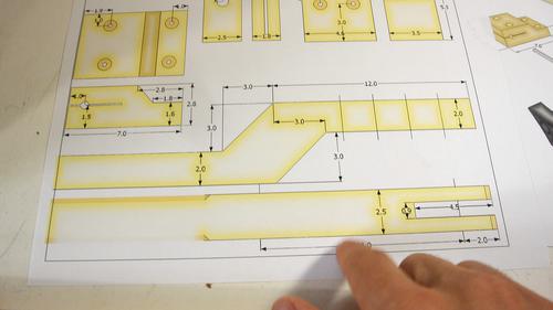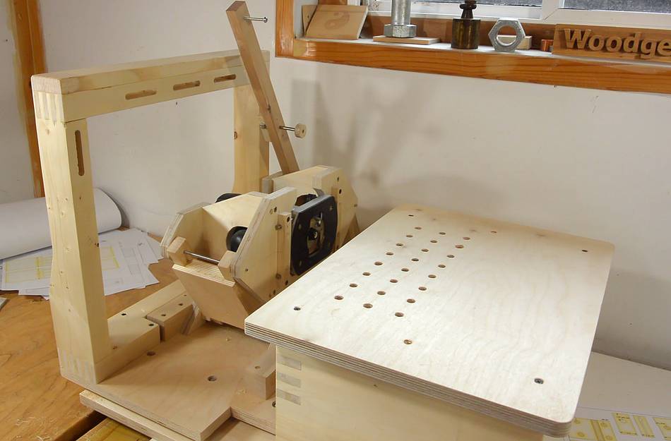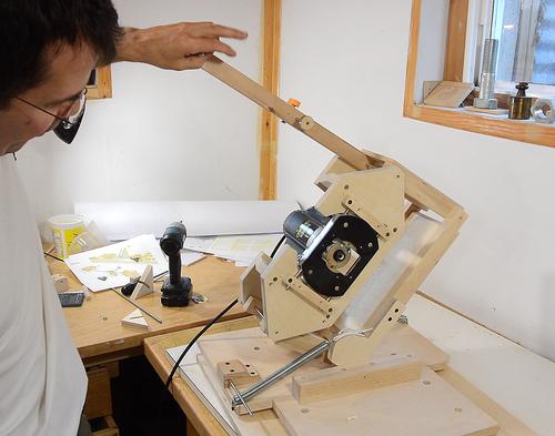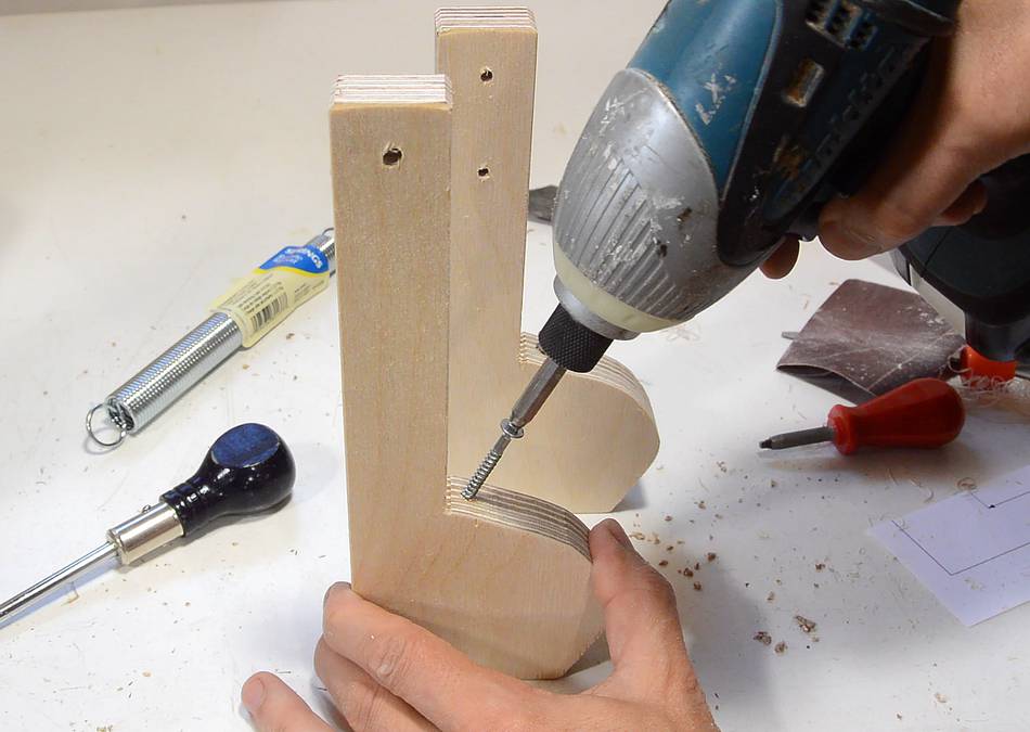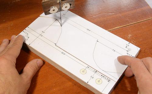 Two cam-shapes for a string to wrap around are cut from Baltic birch,