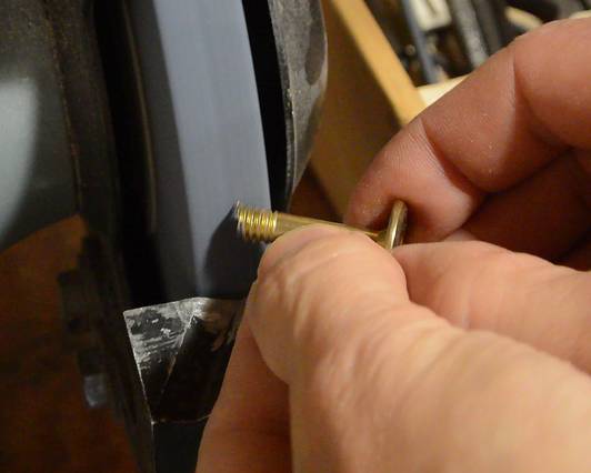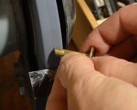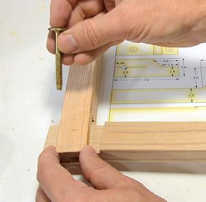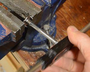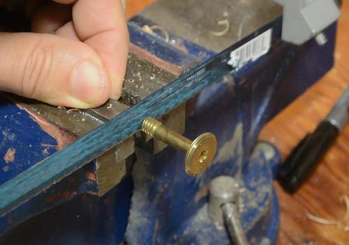 The hinge with the link could be a piece of steel rod or a wood screw. I'm using part of a knock-down fastener screw. I like the large head on it, and the smooth shank will make a nice pivot.