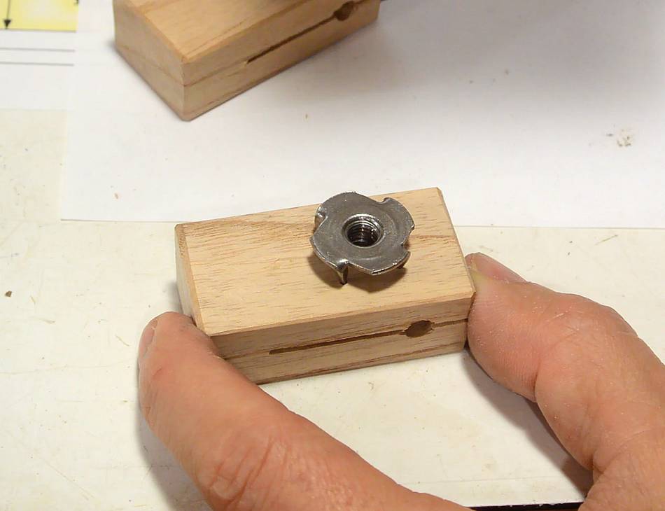 Unfortunately, the knobs have an M6 thread, and the closest I have is 1/4" T-nuts. The T-nut almost fits. So I ran an M6 thread tap into the T-nuts, and now the metric threaded knob screws in just fine.