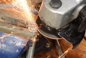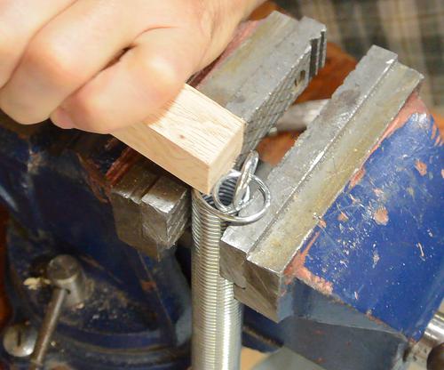 at the end, I'm bending the last loop to the side on the vise, using a piece of wood