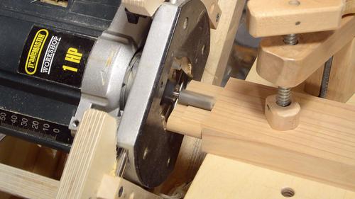 table, and the two small blocks clamp onto the shaft to provide depth stops.