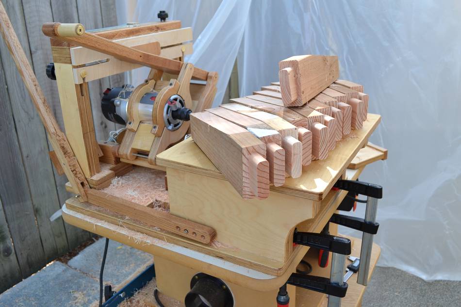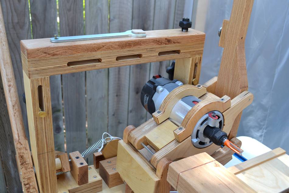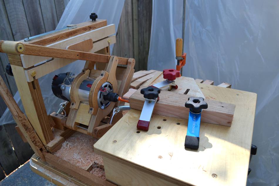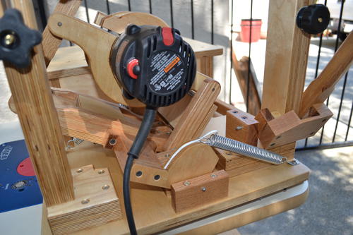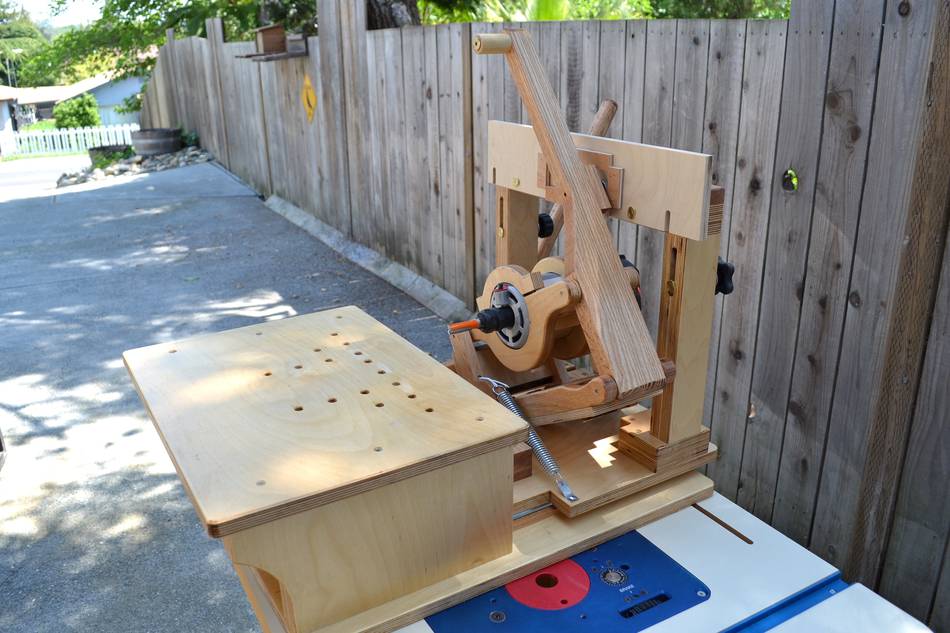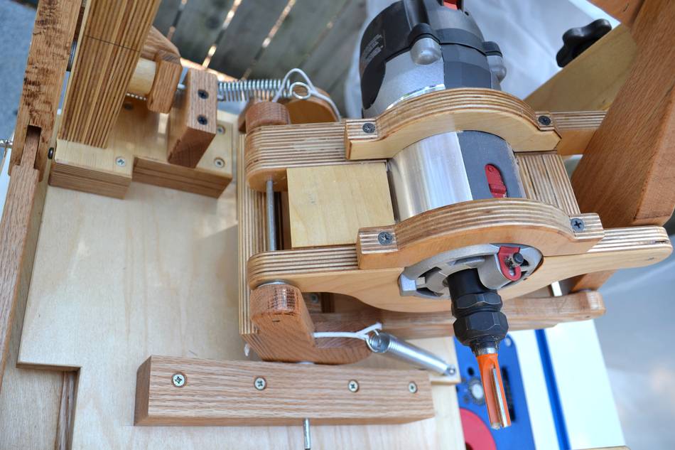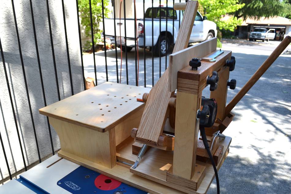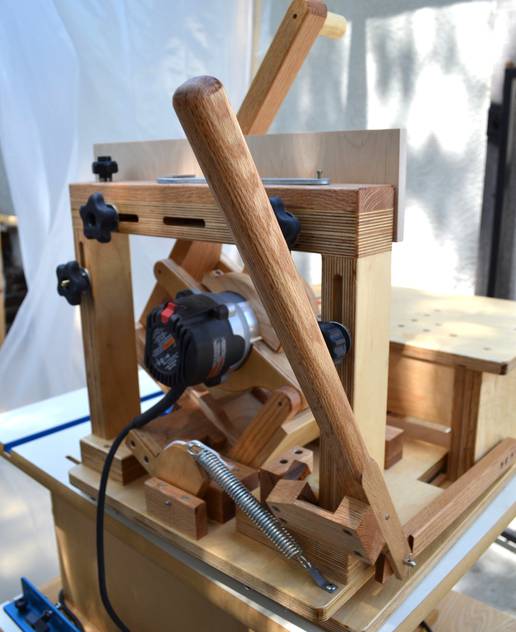 Using the pantorouter to make a lumber rackWilliam cut a score-line around the tenon to avoid chipout (see first photo below). But if you remember to always make a climb cut (with the leading edge of the bit cutting into the wood, not out of), there's no chipout, even without a score-cut. The linkage provides a lot of mechanical advantage, so there is no risk of the router getting away on you, even when climb cutting.