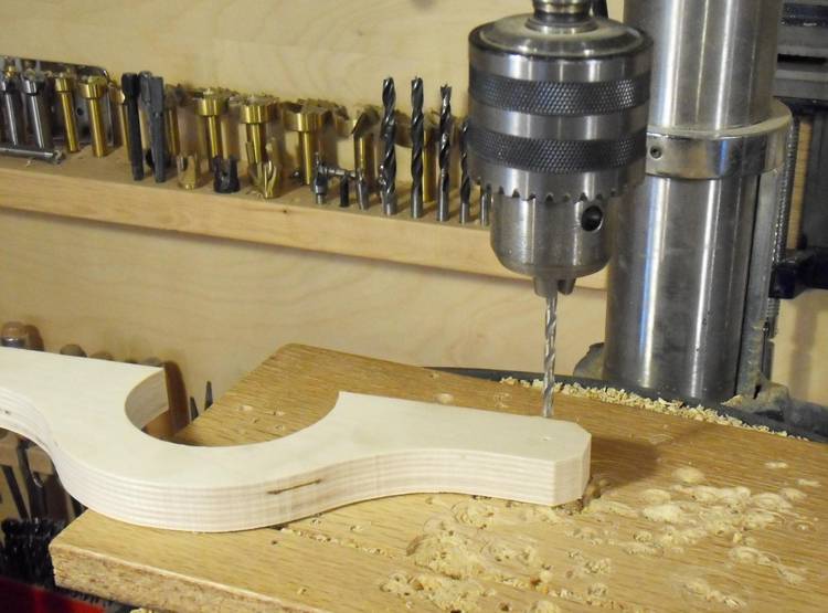Drilling the holes for the shafts. I punched relatively large pilot holes with the awl.