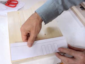 I knew the first slot leaves an 8 mm finger, so with the spacers in place, I used my calipers to position the stop block so that there were 8 mm between the last block and the blade. I didn't bother pasting the templates onto the wood.
