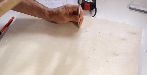 I'm using an awl, tapped with a hammer, to put a divot on each grid intersection...