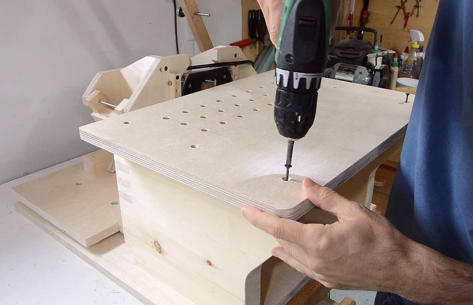 The table itself is screwed onto the base from the bottom, though I took no photos of that.
