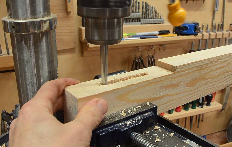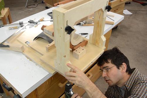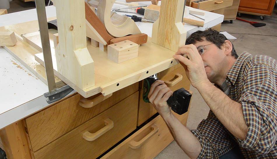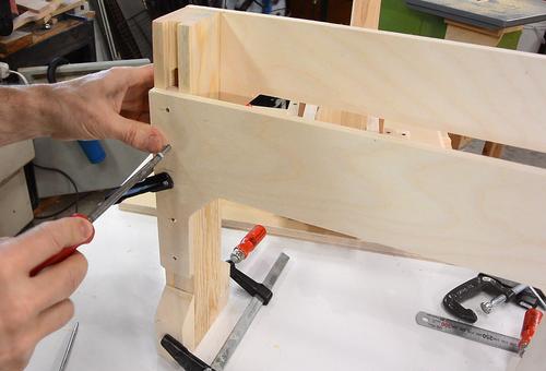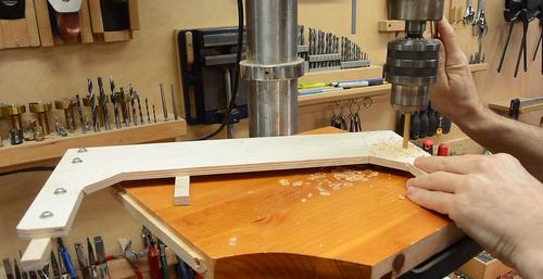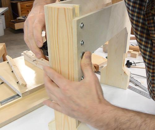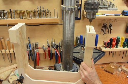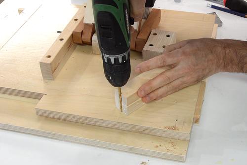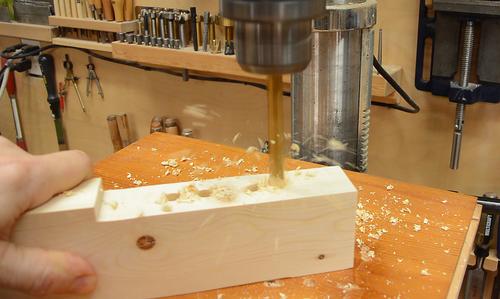 Drilling the screw holes for it. I cut a V-notch in a piece of wood to help