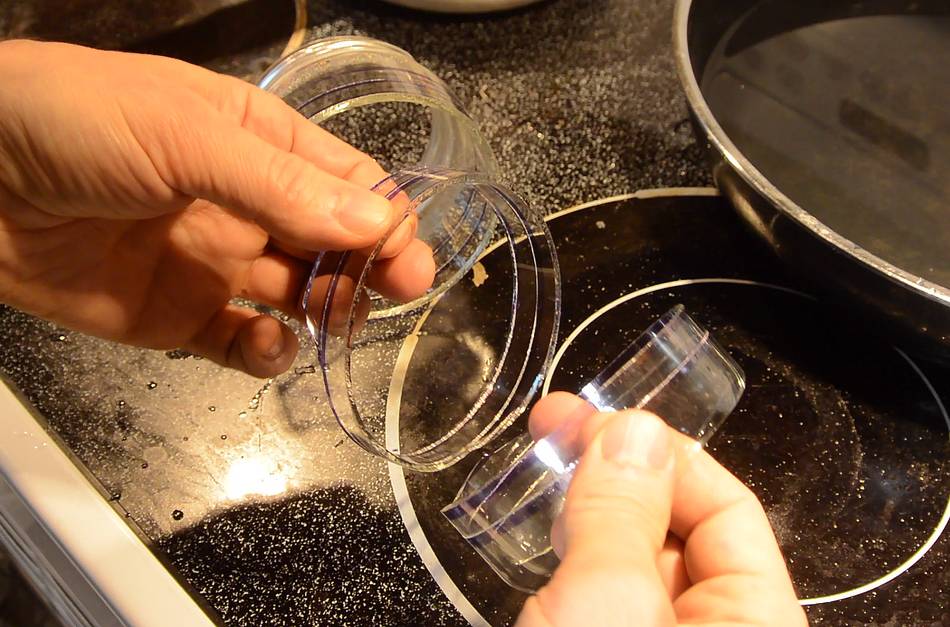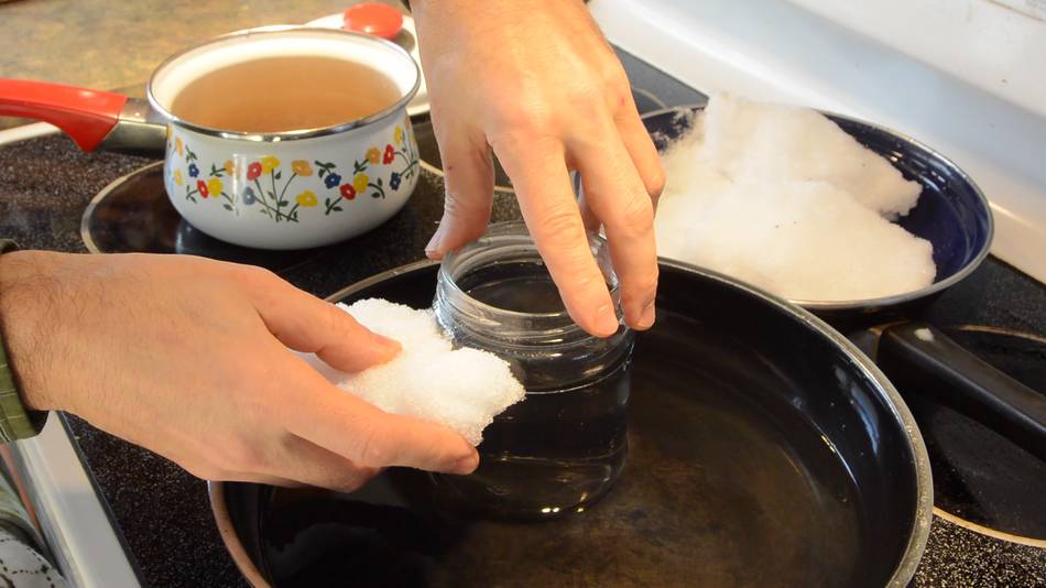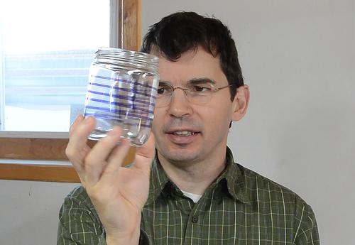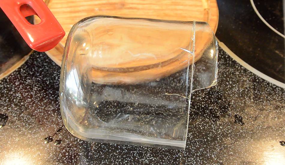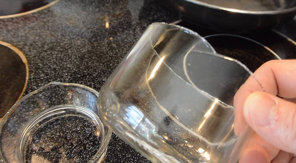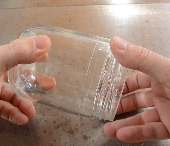 But I had the crazy idea of trying to make a sort of "spring" out of glass by making a helical cut in a bottle. I didn't have any suitable bottles handy, so I used some glass jars. For flat pieces of glass, cutting consists of scoring a line with a glass cutter, then trying to "bend" the glass along the scored line, which causes the crack started by the score to go all the way through the glass, breaking it apart. But for a jar or a bottle, there's no way to just "bend" it. However thermal stress can be used to get the score to form a crack through the glass.