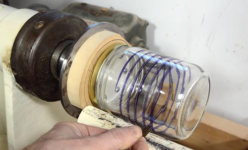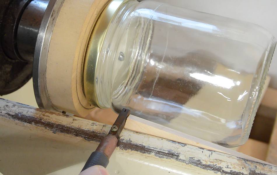 I screwed the lid from one of the jars to the face plate of my lathe, then used a glass cutter to score a line all the way around.