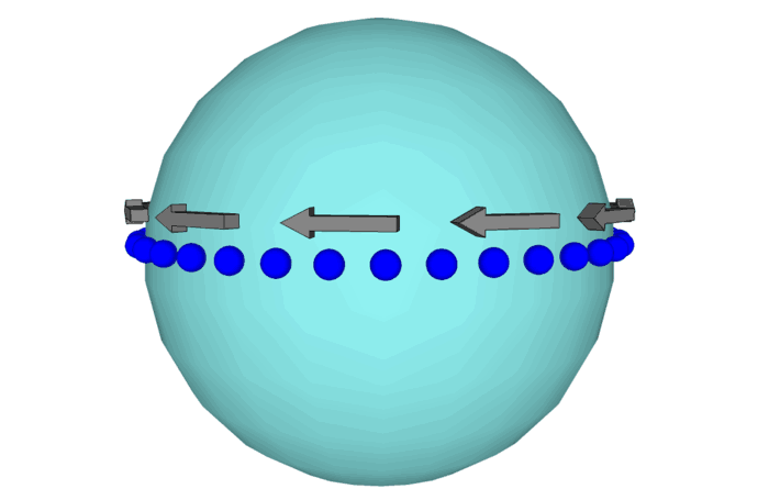 Now, if we have a ring of these, we don't need gravity to hold them together. So now imagine pushing that spinning ring up on the near side, down on the far side, it will still tilt to the right.