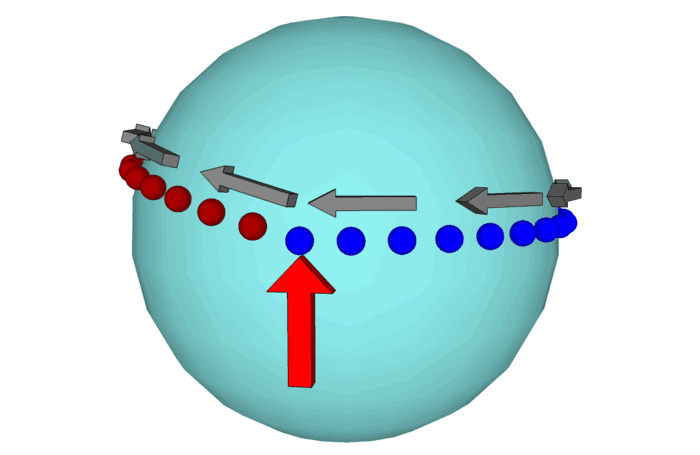 Now, imagine, instead of a single spaceship, we have a whole ring of particles, and we accelerate each one a bit north just a bit as it goes by. The same physics still applies. And if we joined all the spaceships with a ring, that "push" to the one spaceship would just push all the ones nearer to us a little bit, but the orbit would still tilt.
