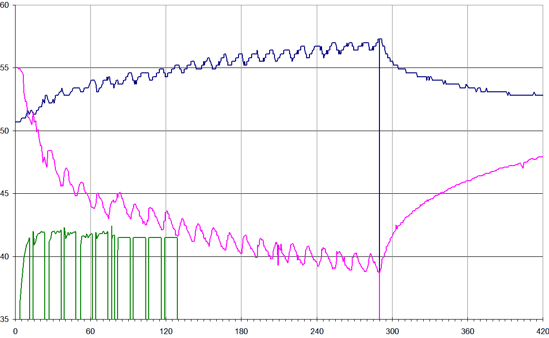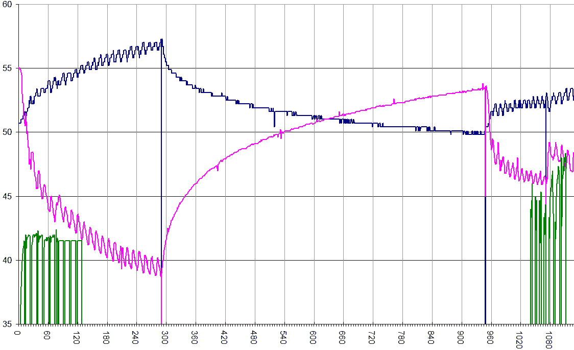The dark blue line is temperature times 3 (to make it fit on the graph). You can also see the temperature go up slowly whenever the compressor is on. It only goes up by a fraction of a degree. The temperature sensor resolution is 0.1 degrees, and you can see it step by those increments.