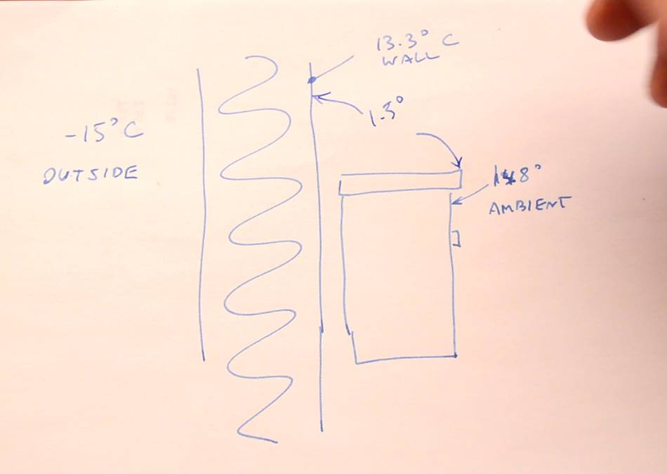 On a cold day, when the outside temperature was -15°C, I measured the wall temperature of our bedroom at 13.3°C, and a dresser near the same wall at 14.8°C. We like to keep the bedrooms at a cool temperature.