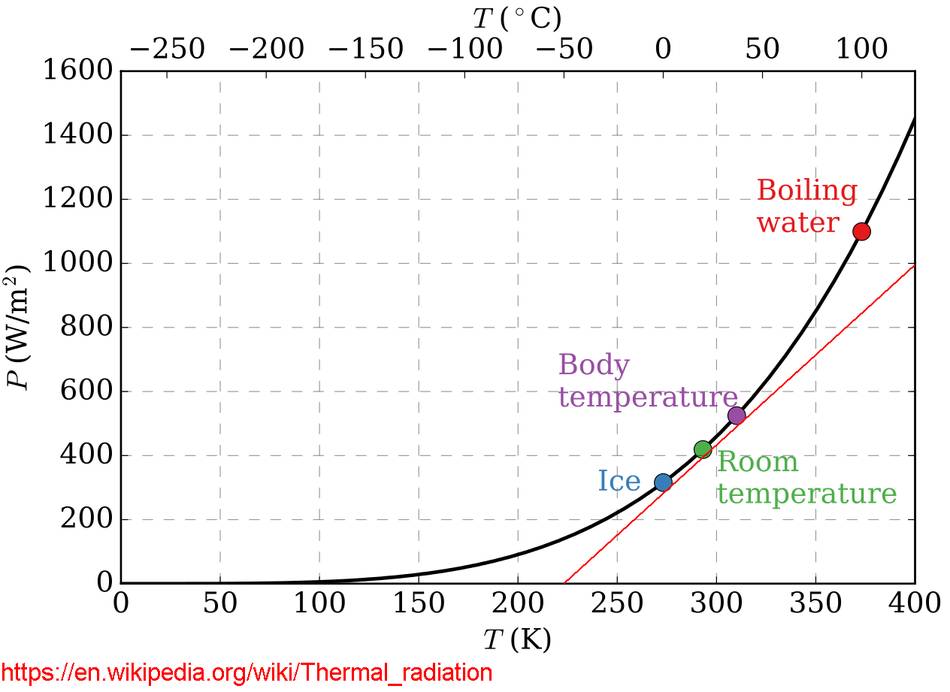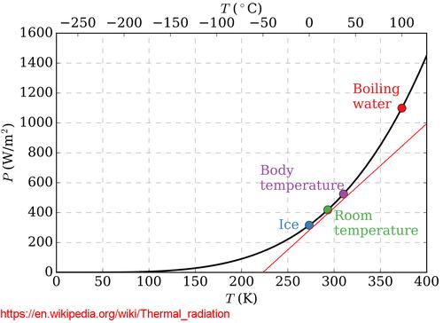 I looked up "thermal radiation" on Wikipedia. The slope of this graph doesn't change much between freezing and body temperature, so I drew a red line roughly parallel, and measured it's slope. The line rises by 1000 watts/m2 over a temperature range from 225 to 400°Kelvin. 1000 watts divided by (400-225) = 5.7 watts/m2°C.