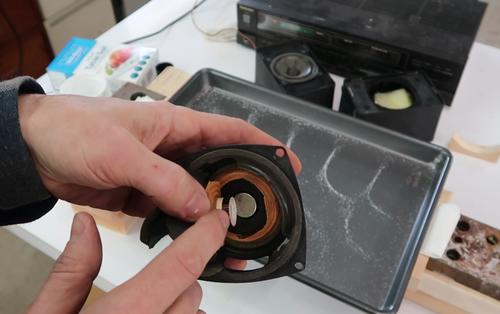 So I tore it open to see the damage. The voice coil was blackened (it's normally red magnet wire). The heat had caused it to distort, and then it rubbed against the magnet.