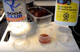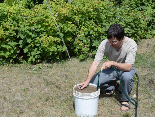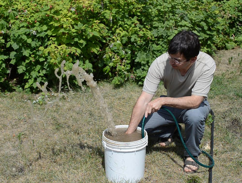 a bucket of muddy water. At left, the jet of water is still above