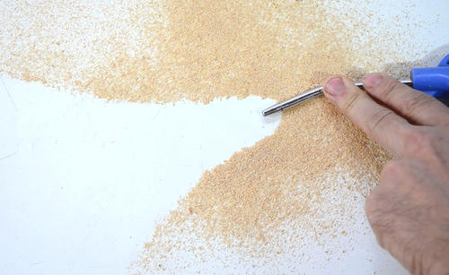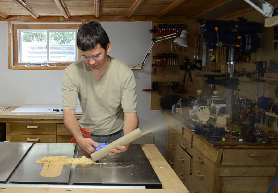 The simplest demonstration is to use a compressed air hose to blow air along a tube of cardboard. I'm blowing air from the middle of the tube towards one end. This causes suction at the other end, which causes sawdust to get sucked through the tube.
