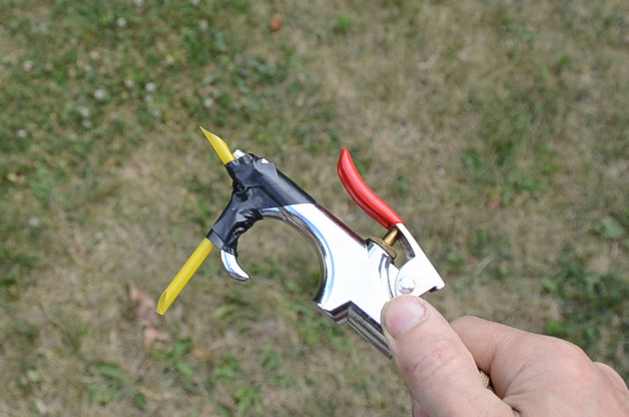 I also tried my store bought spray gun. That produced a richer mixture - not surprising. After all, the spray gun is meant to spray paint, not blow it all over the place. But my spray gun is a relatively small one, so the flame I got from that wans't nearly as big as with my bent straw experiment.