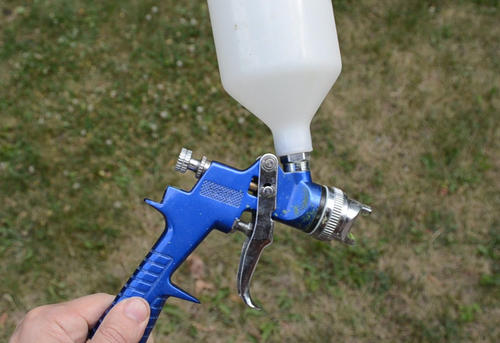 Here's a crude sort of spray gun using a compressed air nozzle and a flexible straw.