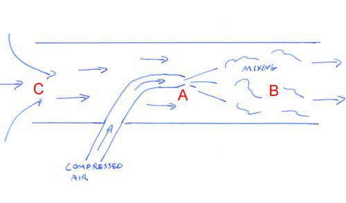 As air is ejected from nozzle A, it mixes with the air in the tube at B Imagine that the air from the nozzle mixes with four times as much air. Momentum is conserved, so this cloud of air, now five times as much as came out of the nozzle, is now moving at one fifth the speed of the jet from the nozzle. All that air moving to the right requires replacement air to be pulled in from the left. So we now have suction at C.