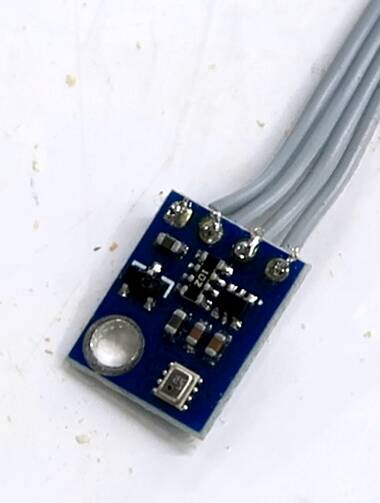 At right, a BMP280 sensor eval board. The sensor itself is the shiny part