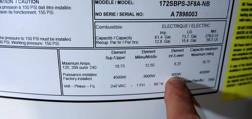 This is kind of clever. The lower element does most of the heating. With it being fairly low power, it usually takes until after midnight to get back up to temperature after bath time. So much of the power use is during off peek times. The tank is owned by NB power, our utility company, and using electricity off-peak saves them money!