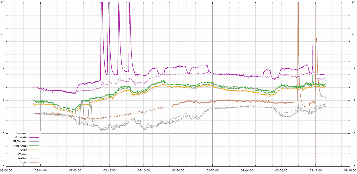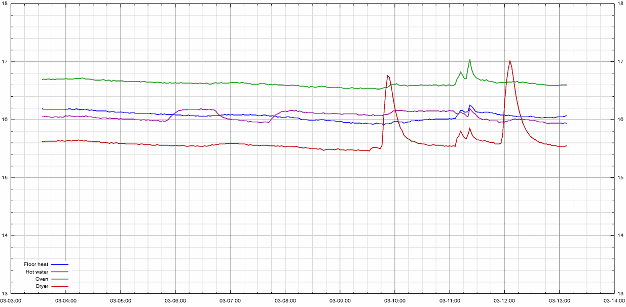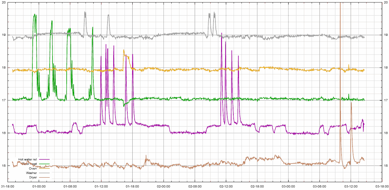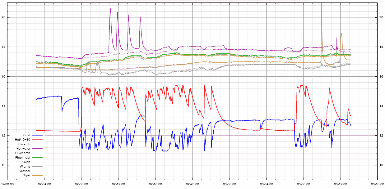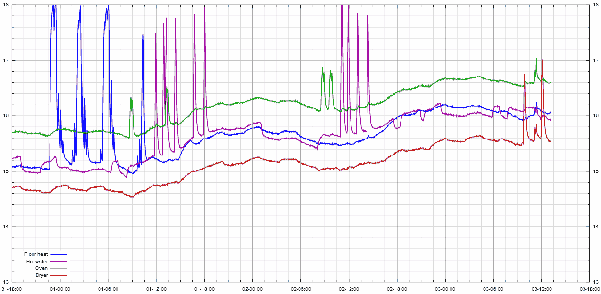 The purple line is the hot water heater wire, which jumps up and down by about 0.2 degrees (Celsius) as the 800 watt element turns on and off. Also much spikes in temperature rise as the higher power elements turn on.
