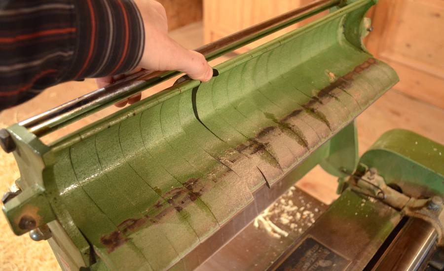 The infeed roller also consists of segments that follow the contours of the wood.