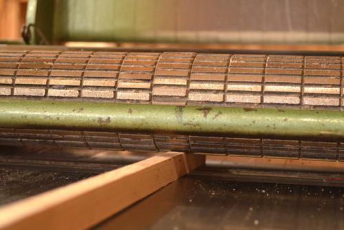 The cutter head is an older style head with three knives, each 20" (50 cm) long. With knives that long, it's difficult to get them sharpened correctly. If the knives have just a slight bow to them, then it's impossible to set them accurately along their whole length.