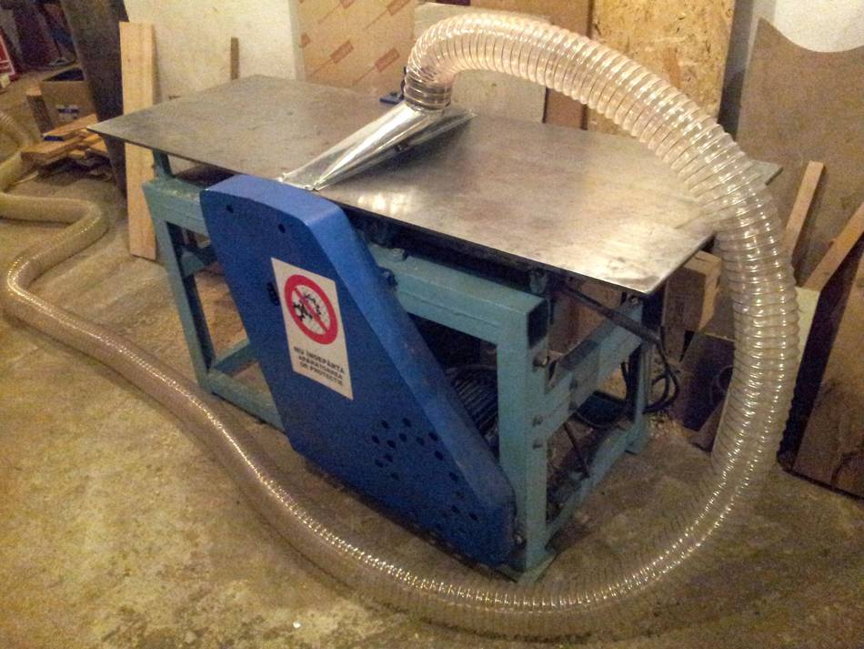 More complicated to make was the collector for the jointer. Because of low height (130mm is the maximum thickness available), I had to make this collector from two parts, otherwise mounting between the two feed rollers would have been impossible. Basically, after introducing the smaller piece between rollers and lifting it, the larger piece (which is made of three parts: a rectangular duct, a rectangle to circle transition and a cylinder) is positioned just below the smaller piece and rising the laminated table, the upper part penetrates inside the lower part by 20mm, becoming a single unit. The materials used are the same, 0.7mm and 0.3mm galvanized sheet and Sn-Pb solder.