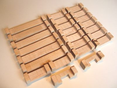 I used 18 mm as my "unit" sizes, so the long pieces are 18x18x108 mm in size. If you build one, be sure to make the notches just slightly wider and deeper than whole unit sizes, so the puzzle won't jam up when you assemble and disassemble it.