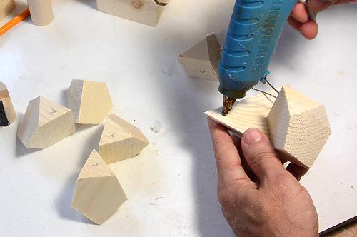 Using hot glue I re-attach three pieces to each triangular pyramid